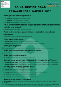 👉 Vous trouverez ci-dessous la liste des permanences Point-Justice prévues pour le mois de janvier 2026.